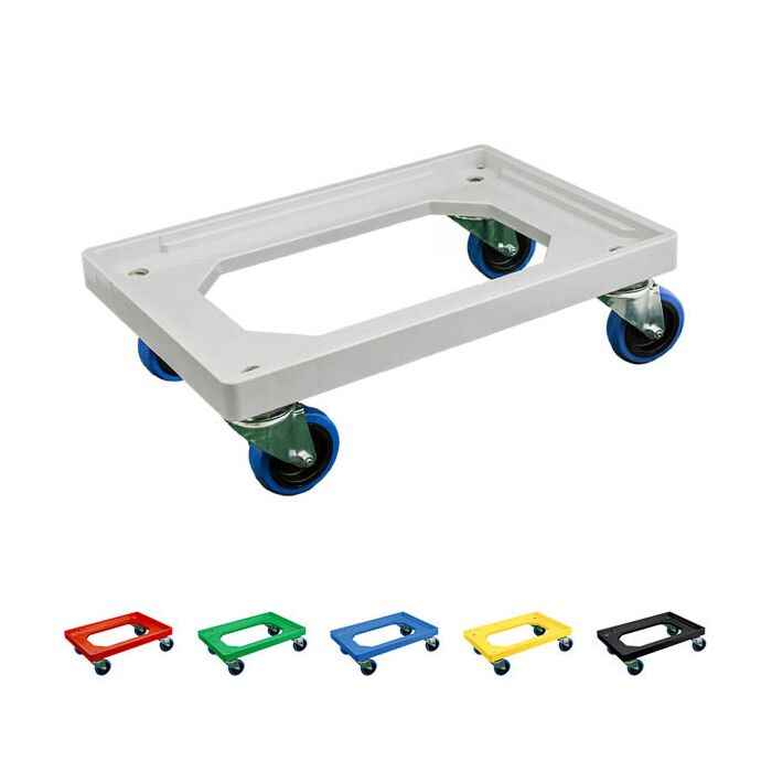 Voor het eenvoudig verplaatsen van Euronorm kunststof bakken of dozen. Voorkomt contact tussen de bakken en de werkvloer, ter verbetering van de HACCP huishouding en de hygiëne. Ergonomisch in gebruik en de dollie beschikt over een draagvermogen van maar liefst 250 kg. Alle soorten zijn uitgerust met PP wielen. Door de zes verschillende kleuren dolly´s is het eenvoudig mogelijk te maken om de goederenstromen binnen uw bedrijf visueel te scheiden. De dolly's zijn voorzien van 4 kunststof zwenkwielen met een diameter van 100 mm. De dolly's zijn onmisbaar als u veel gebruik maakt van kratten en bakken bijvoorbeeld binnen verschillende afdelingen.