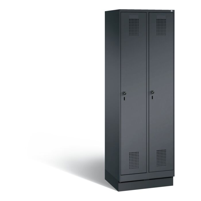 Garderobekast of kledingkast met sokkel en een verbeterde inbraakveiligheid dankzij de extreem buigstijve deuren en de 54°-binnenhoek in de ombouw. Dit zorgt voor veel stabiliteit en eenvoudig en comfortabel uitnemen van de kleding. De kast heeft een duurzame staalconstructie en is leverbaar in 2 afdelingsbreedtes en tot 4 afdelingen naast elkaar. De ventilatie gebeurt middels EBL (het Evolo-ventilatieconcept). De deuren zijn rechts scharnierend, met makkelijk te reinigen ventilatiegaten en een voorgestanste etikethouder voor geïntegreerde nummering. De comfortabele aanslagdemping zorgt voor goede sluiting. De elegante smalle zijkanten van de ombouw zorgen voor een homogene look bij opstelling naast elkaar in een rij en voorkomen brede naden tussen de kasten.