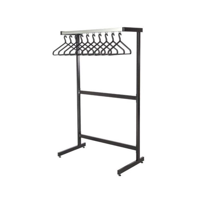 Enkelzijdig vrijstaand garderoberek met een hoogte van 1700 mm. De staanders zijn van rechthoekig stalen buizen, afm. 50x25x2 mm. en geëpoxeerd in RAL 9011-zwart of een andere standaard RAL kleur. De garderobe heeft 10 sterke zwarte kunststof ooghaken en kleerhangers per meter en een blank geanodiseerd aluminium hoedenrooster. Het geheel staat op verstelbare pootjes.