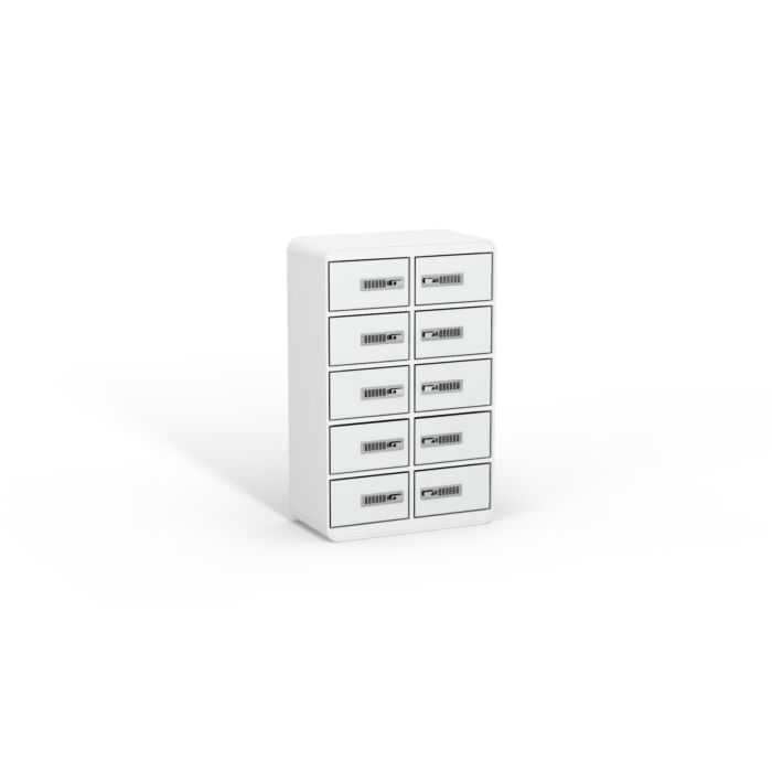 Compact en duurzaam lockerkastsysteem om persoonlijke elektronische apparaten veilig op te bergen en tegelijkertijd op te laden. De oplaadkast voor telefoons of laptops.Â