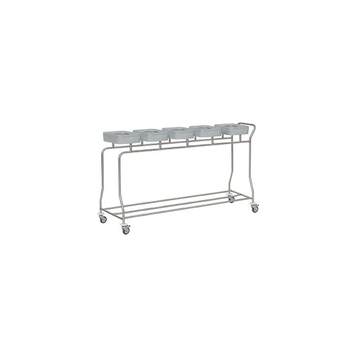 Hygiënische RVS wasverzamelaar. De afbeelding met 2 vakken toont de optioneel verkrijgbare pedaalbediening, de optionele rubber beschermingsschijven en de optioneel verkrijgbare rood gekleurde deksels met Softclose scharnier.